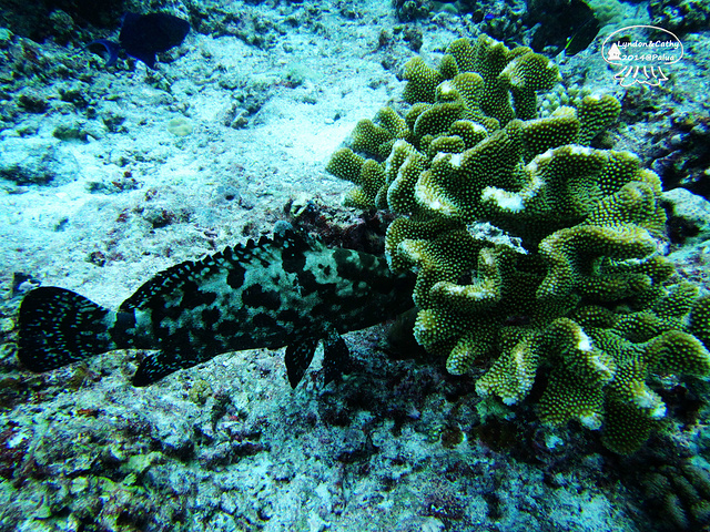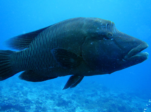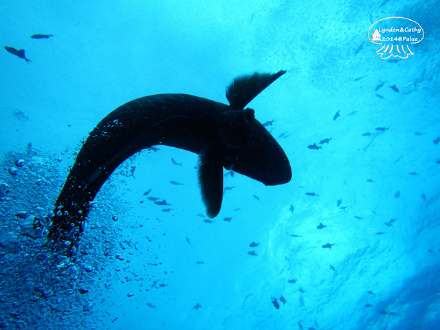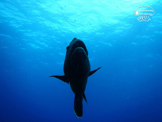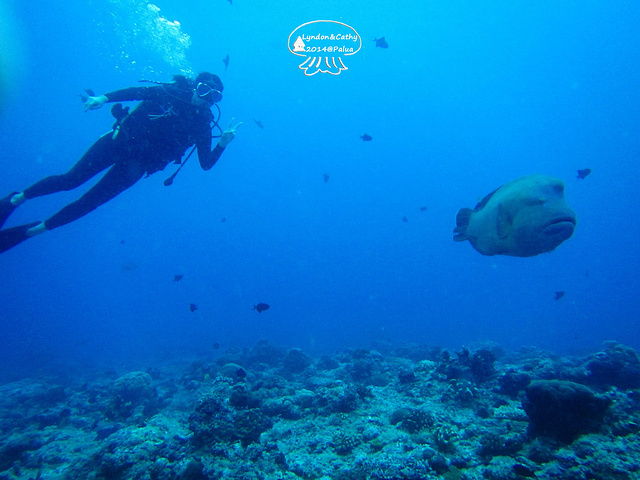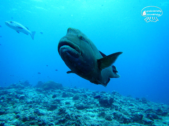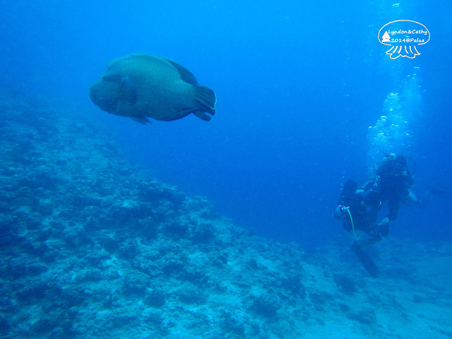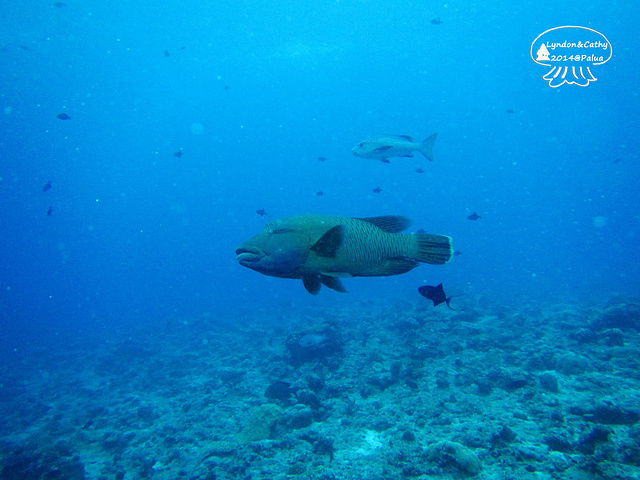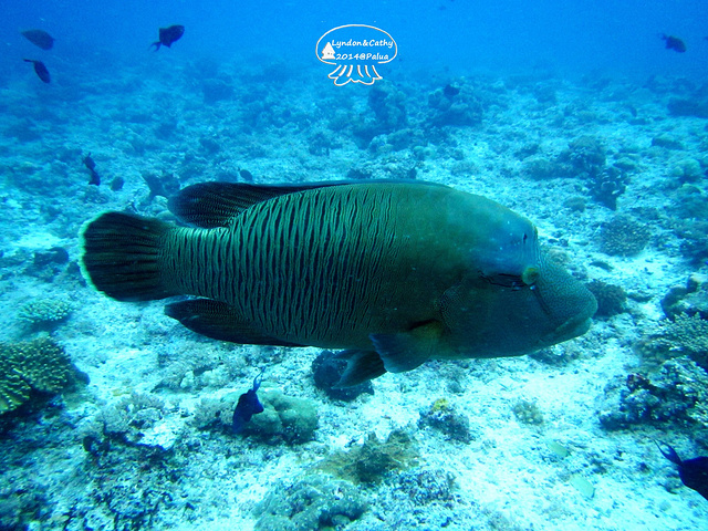 定睛一看,原来是传说中的“大宝”,帕劳最有名的大苏眉。据称,这条常年在蓝角这边生活的大苏眉,已经超过30岁了,我们小的见到还得喊它一声大哥。