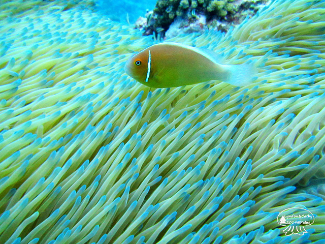 这是今天潜水发现的最漂亮的海葵了。每个触角都是浅蓝色的,像一只只蓝色的小眼睛,随着洋流飘动,而NEMO则顶着洋流静止在海葵屋顶。