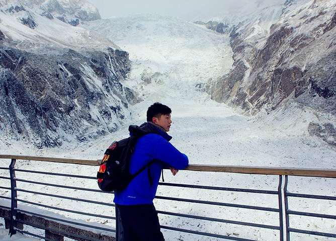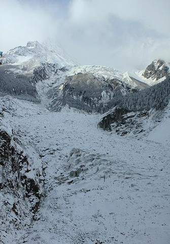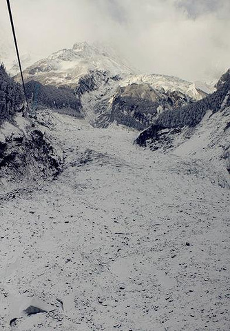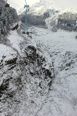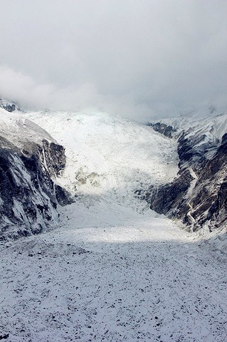 四号营地(3600米): 必须坐索道上,索道下,所以索道的票是木有单程的,往返150元,学生票140元;四号营地是木有酒店的,最大的卖点是可以看到落差1100M的冰瀑,可以看到整个海螺沟的一个回转,最重点的是,运气好可以看到贡嘎主峰! 其他还有一些小的景点,比如红石滩,四面佛啦,纪念碑啊,看个人喜欢,这边也可以同样下到冰川去,不过都不能走远,更不可能横跨冰川,否则掉入冰裂缝。。。。你懂的,世界照样转动。。。只是神马也没了。。。 手机的全景图发不上来,各位YY一下,把以下2张画面在脑海里结合在一起。。。。没错,就是这个样子,大冰瀑在眼前转了个弯,就到了下面的山谷去了; 个人建议,如果时间允许,4号营地是值得上的,就好象你看到一个身形姣好的女生,确一直看不到她的容颜,来四号营地,就可以一睹芳颜啦
