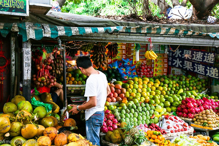 中午要离开三亚去分界洲岛。 早起在酒店的露天泳池游了一会儿泳,吃过早餐在附近散步。 去分界洲岛的车在环球潜水中心旁边乘坐,离夏日百货很近。 上车前在夏日百货后面的水果摊买了一些零食和水果带上岛。