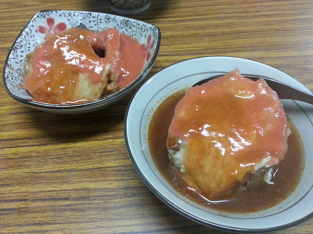 到了淡水,当然要品尝当地最有名的小吃,阿给——其实就是豆皮里边包着粉丝,然后浇上一点腐乳吃