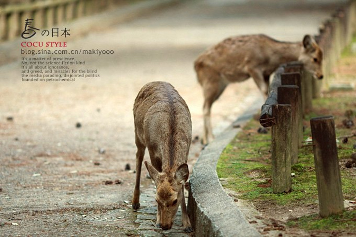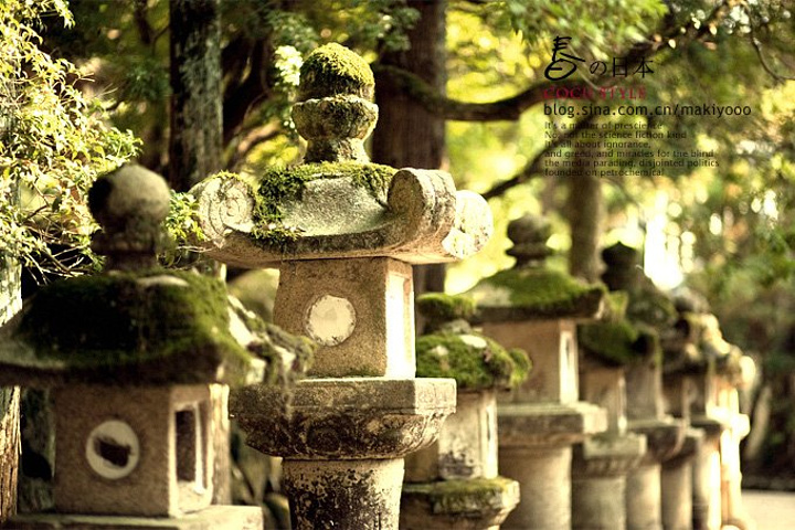 从奈良公园沿着表参道走向春日大社,表参道上两旁是原始树林,古木参天,遮天蔽日,这片树林从公元9世纪开始就禁止砍伐。正午猛烈的阳光也失去了威力,只剩下斑驳的光斑,使整条表参道像是进入黄昏。没什么人到这边来,鹿也少,和奈良公园的人鹿喧闹景象成强烈对比。