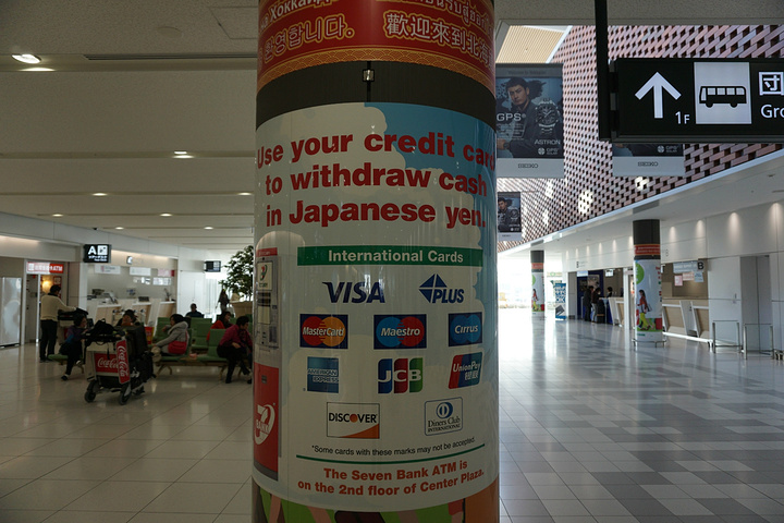 印有各种语言欢迎语的廊柱,下面是还有日本7-BANK的广告,可以用各种信用卡(包括银联)在ATM机上提取日元。后来的事实也说明,去日本旅游,不需要携带大量现金,几乎所有地方都可以刷卡,或者使用ATM机取现。