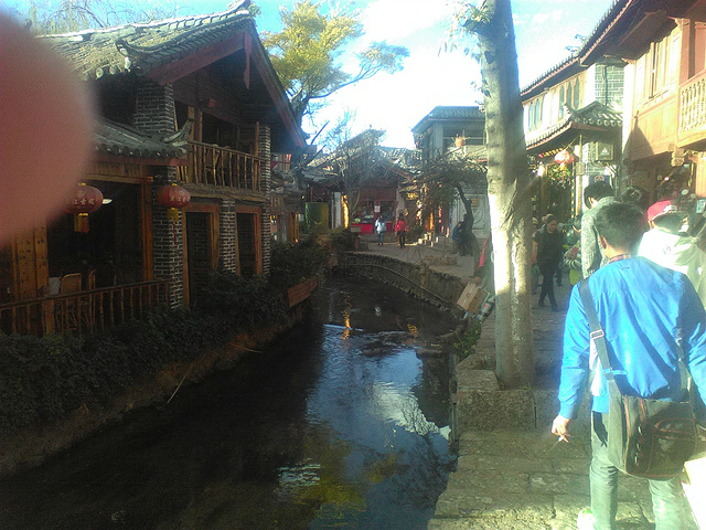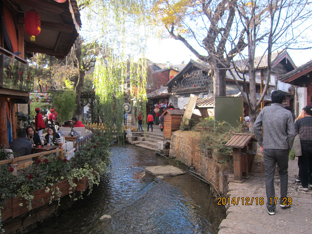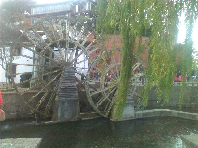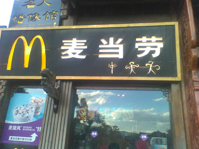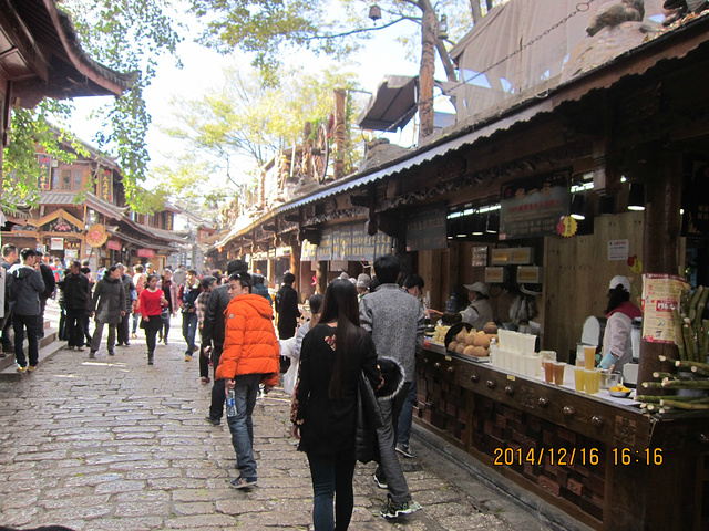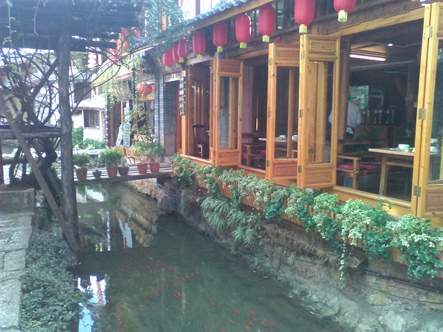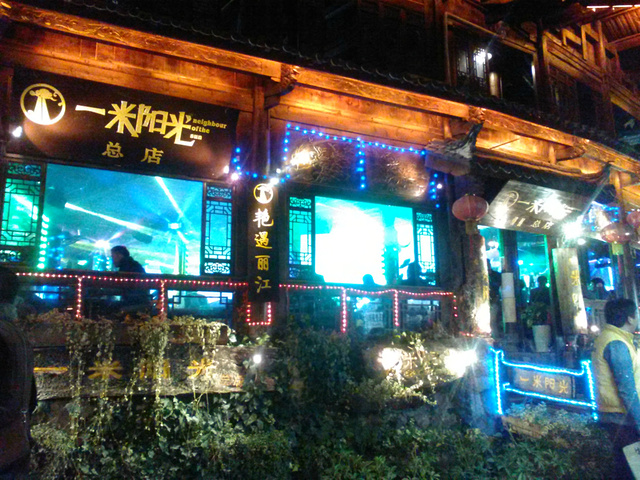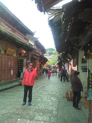 10点醒来以后在客栈管家的介绍下初步了解拉一下古城的大致情况,哪里好吃、哪里好玩、哪里比较坑人,管家将这些东西全画在地图上,将地图交给我们。不得不说这家客栈的服务真的不错,如果有兴趣的朋友可以记一下,他们家叫丽江童话精品客栈--神话店。是在去哪网上看见的,中评,差评都是0评。 拿着地图在古城里面转悠着,古城里面有各种特色小店,但楼主最喜欢的就是卖那些丽江手鼓的小店,店里一般会有一个美女店主拍着手鼓,配上丽江原创歌手的歌曲确实让人不舍得离去。但是那些卖什么所谓哈根达斯雪糕的就不要去啦,你再问他们价钱时他们不会告诉你多少钱,而是主动推荐什么样的雪糕好吃,你若是买啦吃上以后你就知道最便宜的15元,最贵的25元,而且还不好吃,楼主深有体会。哭。。。。。。 白天看看古镇风情,来到大水车看着那标志性的水车,许愿的驼铃,还有那特有中西结合在牌匾刻上纳西族文字的麦当劳,在这种慢慢的节奏下体验丽江的慢生活。到啦晚上可以看见不同于白天的舒缓,恬静。晚上则是很富有现代气息,五彩的霓虹灯,劲爆的酒吧一条街,可以和朋友们在一家你喜欢的酒吧点上一杯饮料或酒水,细饮慢酌的看着小桥流水,聊着开心的话题。但是在这里楼主还是要提醒大家一下,丽江的酒吧消费很高,性价比很低。588的套餐,6听啤酒,一个爆米花,一小盘瓜子,一小盘干果。(在沈阳这个价钱不敢说玩到嗨,但是弄个包房,啤酒,干果什么的绝对没问题)而在客栈,我们所有客人在一起玩,10个人花120元钱就玩到啦嗨。