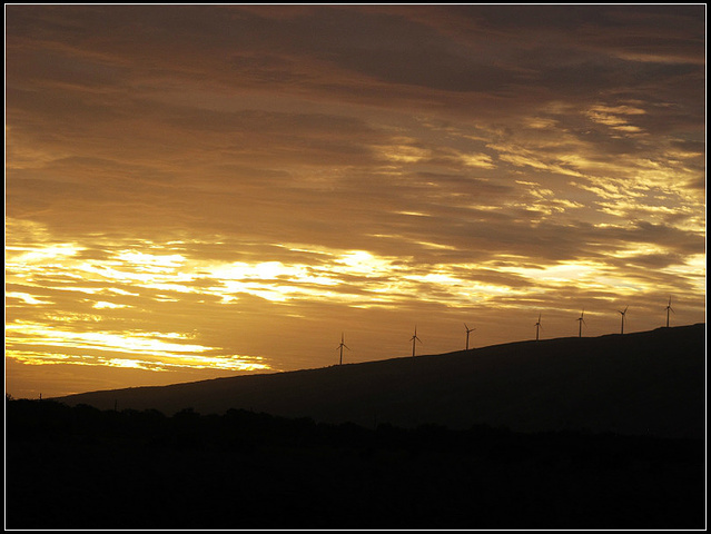 山坡上的原本应该高大的风车,在夕阳映衬下,格外孤立和弱小