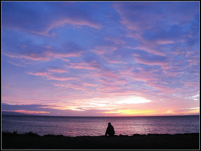我们走到 海边欣赏,这是小F的背影 我问他,一个孤独的男人,在想什么呢? 他说,我不孤独,这不还有你嘛。 然后一把拉我坐下,于是包场观赏,这静谧的海边日落。