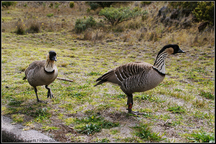 在停车场的时候,我去扔垃圾,要开车门 小F说:看! 两个悠闲自得散步的hawaiian googe 叫夏威夷鹅,或者夏威夷黑雁,俗称nene ,是这里的特有物种,也是夏威夷的州鸟