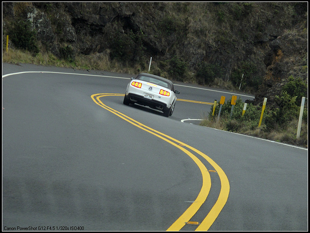 回去的都是下坡,弯道又比较多 开车要比较小心了,前面一辆跑车速度比较慢 被小F穷曹了 他一开车,废话就很多,常说的就是:别跑! 然后就跟人家跟得紧紧的