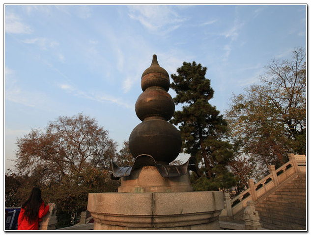 从黄鹤楼上下来,走到楼后,远远就看到了红红的千年吉祥钟。靠近千年吉祥钟时先看到了宝铜项。宝铜顶,系清同治七年(公元1868年)所建的黄鹤楼端顶,高3.4米,底径1.8米,壁厚4厘米,为青铜铸成,重约2吨。铜顶上端为宝瓶攒尖顶,中部呈球体叠加形成的葫芦型,下部为莲花宝座。光绪十年(公元1884年)黄鹤楼被火焚毁后,仅遗此物。