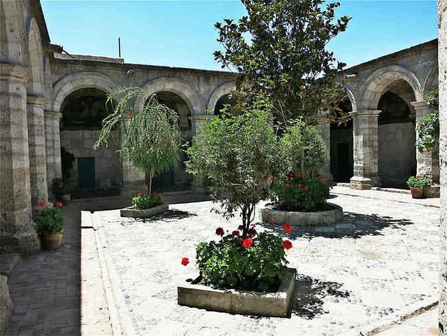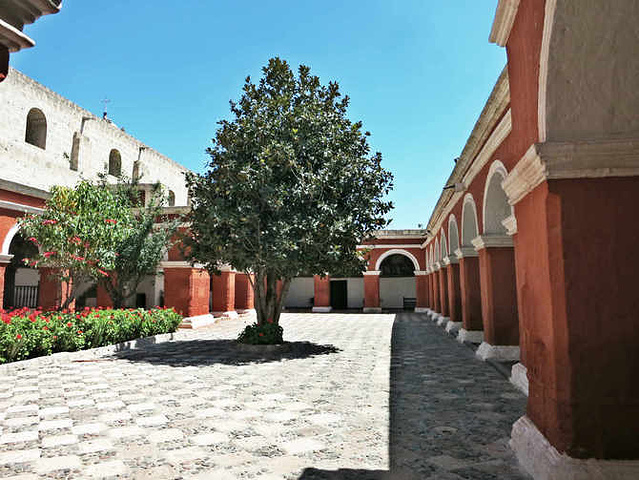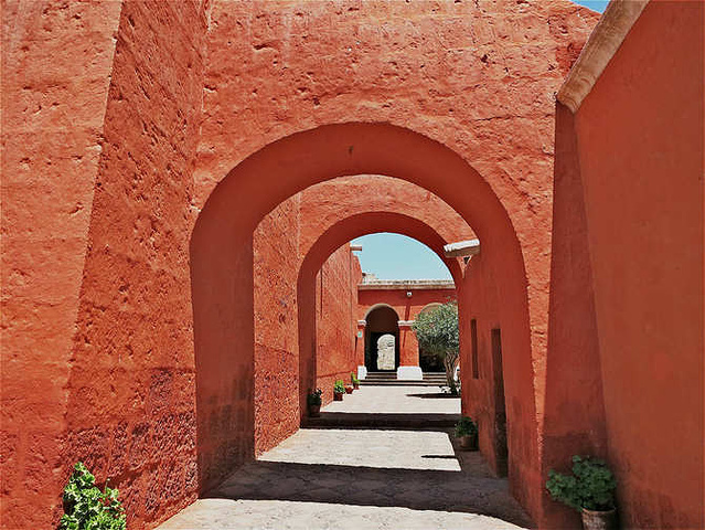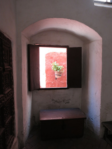 门票35sol/人,在秘鲁算是宰人价了,买票进入院落后第一重院子是patio del silencio,一下子就被院落围墙的鲜红色吸引了,还种植了很多献花,后来看到整个修道院都如此。侧面有个小通道,通往会客室,这里是唯一的修女与修道院外人士(包括亲属)见面、会谈的地点,并且全部会谈过程有高级修女在一旁监督。后来听导游说即使生病了也是从外面请医生进来,而不允许外出看病的