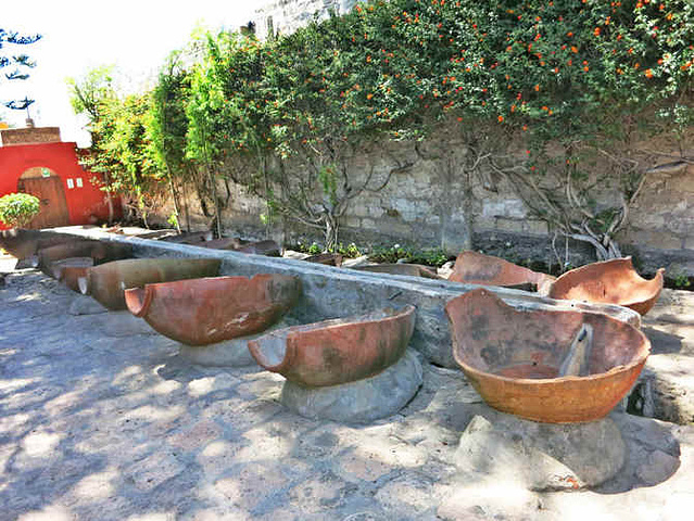 在Toledo大街还有一家咖啡厅,在一处小庭院内,导游推荐我在跟她走完一圈后,可以再来这里小坐一下,我看看了门口的价目表,表示还是算了吧。穿过toledo就到了后院,看到了洗衣服用的大缸,导游还亲自示范,讲解了如何使用:原来大缸旁边是水槽,用手或挡板把水槽挡住,水流就从水槽旁的空隙流进大缸里了。洗衣区旁边是洗浴区,是一个大坑,顶上可以用树叶等遮蔽。后院的南北两侧都是花园,北侧的在修女生活区里不对游客开放,南侧的是开放的
