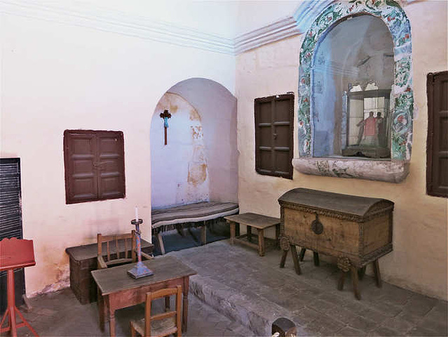 修道院还要求修女自带衣物、家具等,于是有些修女就把家里的宝物都搬来炫富,例如修道院里收藏的一些中国瓷器,就是那个时代修女带来的 导游带着参观了一些古代修女住宅,这里的房屋最早也没有集体住宿的制度,各住各的,各修女家自己花钱修建,所以大小不一,有钱人家就修大一些,穷一些的就修小的;另外大户人家的修女还带来奴仆,修的住所也包括奴仆房,修道院里人数最多时候有450人,包括修女和她们的奴仆,住在80多处房屋之中。这些房屋虽然有大有小,但内部装饰、布局都差不多,特别的一点是床铺都放在墙壁的凹陷处,这是为了防地震