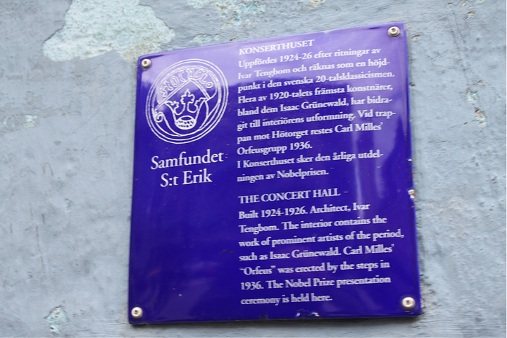这个就是每年诺贝尔颁奖仪式举办的地方。是个音乐厅,没有音乐会没办法进去。它朴素简单得几乎看不出来,只有这个小小的牌子贴在掉了皮的墙上,才知道它就是那个鼎鼎大名的诺贝尔颁奖音乐厅。