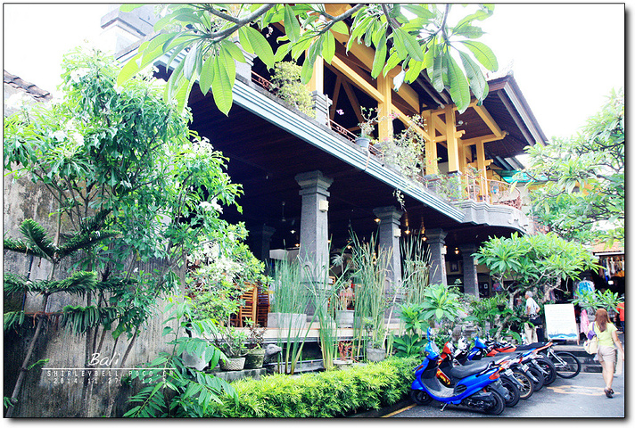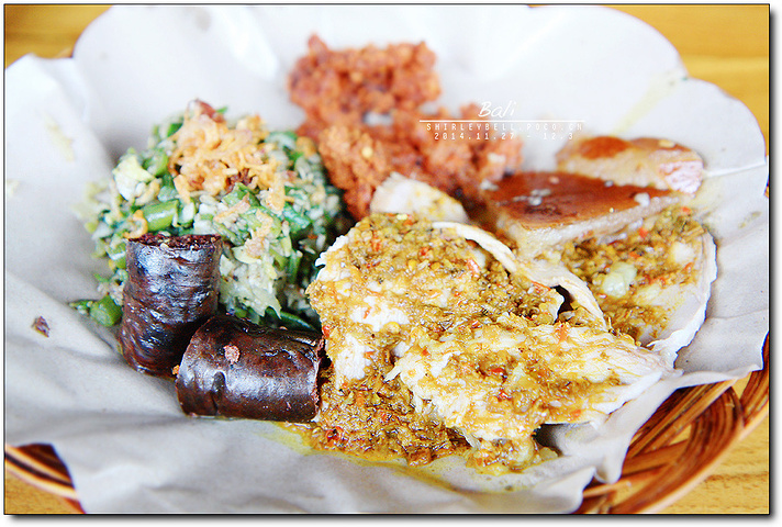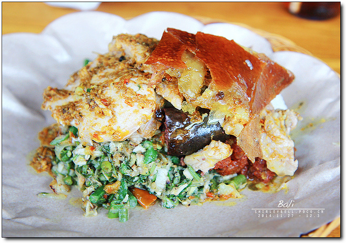 午餐:Babi Guling烤乳猪 ( Ibu Oka Babi Guling) 烤乳猪(Babi Guling)是巴厘岛名菜,整只乳猪填满香料,架在火上烤到皮脆肉嫩,配米饭吃。巴厘岛街头有不少卖烤猪饭的小店,总是挤满当地人。 很多游记里都会提到的Ibu Oka Babi Guling在乌布王宫对面,被大家一致认为是世界上最美味的烤猪饭。 早晨接了我们的时候,我就和司机小伙说我们的午餐想去 Ibu Oka吃烤乳猪饭。 从京打马尼火山下来,他就把我们送到了Ibu Oka Babi Guling,但是并不在乌布皇宫附近,看了菜单我才知道原来现在Ibu Oka Babi Guling已经有三家店,我们来的这家也是其中的一家店之一。店是独门独院的,一共两层,绿树环绕,还有院子,下面一层是普通的桌子和凳子,二楼是盘腿席地而坐那种。 后来也有路过乌布皇宫对面那家的Ibu Oka Babi Guling,店面比较小,没有我们去的这家环境好。
