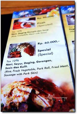 点了一份套餐(包括汤),一份招牌的烤乳猪饭。上图可以看到都包括什么。 那个皮非常好吃,脆脆的很香,也不油腻。烤乳猪肉上面有很多调料,肉质也很入味,拌着饭吃很好吃。巴厘式的杂蔬感觉还不错。 下面还有米饭。