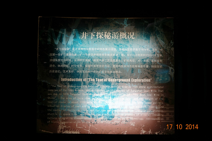 选择这里,完全是被“井下探秘”所吸引,不知道是不是“鼹鼠的故事”看多了,特别喜欢地下的景点,什么地道呀,地宫呀,充满着神秘的气息。 矿山公园位于唐山市区,是在开滦唐山矿业公司废弃的矿区上建立的。景区分为博物馆、井下探秘、“中国第一佳矿”分展馆、“电力纪元”分展馆、中国音乐城、三大工业遗迹等主题景区,目前只有博物馆和井下探秘两部分开放。 矿山公园是不要票的,博物馆40元/人,井下探秘100元/人,两项的通票120元/人。建议提前在网上团购,井下探秘65元/人。我们对博物馆没什么兴趣,只买了井下探秘,在门口取票时工作人员主动帮忙联系下井的时间,服务周到。 “园记碑”紧邻停车场,座落在一处废弃的厂房之上,上刻《开滦赋》,对面就是公园大门。进入大门,在园区中央矗立着用黑色花岗岩雕刻的公园主碑——“世纪追梦”,主碑左侧是以开滦标志“双环金钻”图案做成的喷泉广场,整个园区四周还散落着各种以矿工为题材的雕像,雕像以黑色为主,形态逼真,据说花费了不少银子。穿过主碑就来到了博物馆,博物馆分为四层详尽展示了中国煤矿工业及开滦煤矿的发展。井下探秘的入口位于博物馆地下,下午三点有免费的导游讲解,我们到时导游们全部在馆内讲解,工作人员让我们到馆内边看边等,虽然我们没买博物馆的门票,不像某些景区严防死守的,同样都是景区,差别咋那大呢。通过百米斜巷进入纵横交错的唐山矿井下半道巷遗址,开启了我们的探秘之旅。在井下可亲自进入镐刨、落垛、炮采、普采、高档普采、综采和综掘七个实景实物工作面,切身体验采煤的过程,还可以乘车在巷道内穿行,只可惜车箱是封闭的,只能从显示屏上看见模拟的行车路线。 强烈推荐,值得一来。