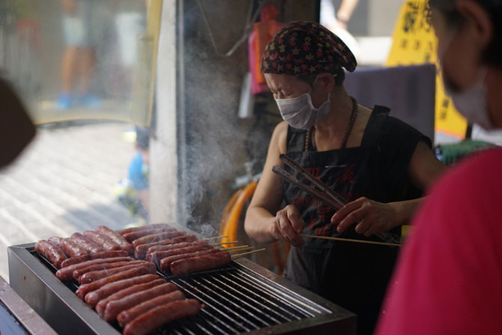 烤肠这个店人气相当火爆,队伍排成两行还带拐弯。看招牌只卖香肠能卖二十年,实在也不容易啊……在家我基本上不吃烤肠,大家都知道,两块钱一根肠里头会有肉吗?吃的都是淀粉加香精色素。这家的烤肠,至少看起来还挺有食欲。尤其是脂肪加热变成油脂后刺破肠衣,迸溅出来的油花和烤焦的肉味,简直是肉食动物的致命诱惑!诸君看到下图一排排炭火炉上的烤肠,没有流口水的……请面壁。