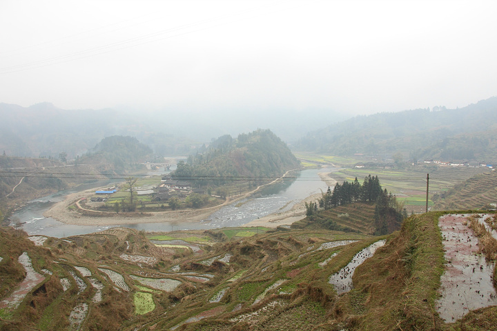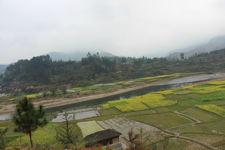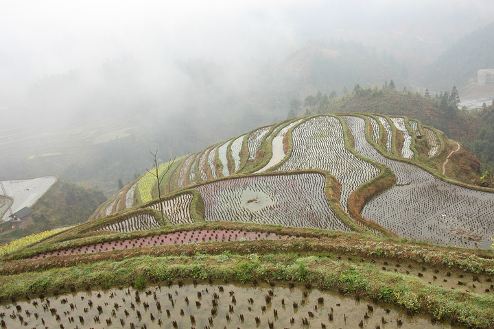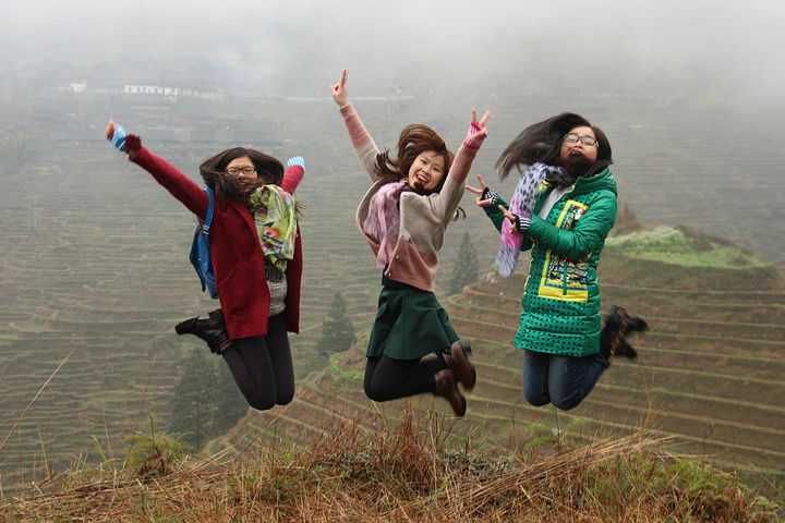 网上搜索从江,加榜梯田的排在最前面,看到网络上的图片,让我们对它充满期待。 第一天在入住宾馆的时候碰到三个阿姨,广西柳州人士。一看到我们就问行程安排,知悉是加榜梯田就拉我们拼车一起去。我们思虑再三同意。恩,这是一个很好地决策。阿姨们跟司机谈好价格,并答应随走随停,就跟自己自驾无异。往返车程加赏玩时间一共花去十二个小时左右,600车费,7人。另外20/人的午餐,这一程便宜到让人惊叹。所以去加榜包车就好了,最好找个好天。 去加榜的路上途径第一天去过的岜沙,过了岜沙苗寨,开始看到山路两边都被迷雾笼罩,无甚风光可言。不过当车行驶到山脚下时,零零星星的油菜花,隐约可见的梯田和如镜面般透彻的湖水、倒影都被我们惊叹。驱车来到最为壮观的梯田风光处,我们正式开启了撒欢乐的嗨模式。 在自然风光最震撼的地点,我们会由衷被感染。那是宏大的、壮观的,也是融入了人类智慧的。当然,我们时运不济,遇上浓雾,所以也像仙境般天地间只有彼此没有风光的~