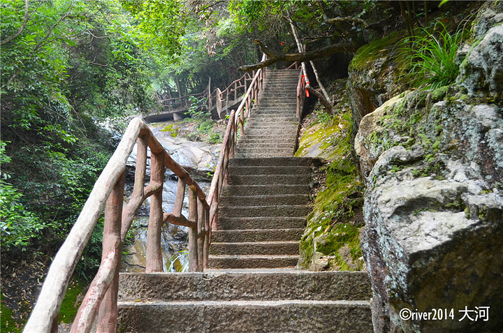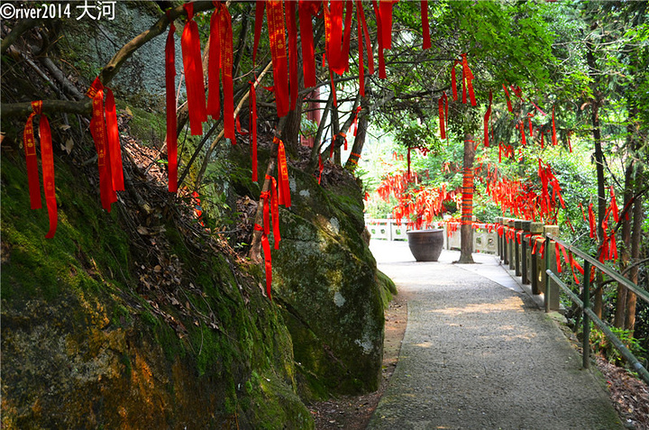 从河桥古镇开车5分钟就到了浙西三峡,同样是位于柳溪江畔。这一段的江边山峰林立,景色幽静,需要乘坐快艇游览三座峡谷,并无人行的道路。快艇在水面上飞驰,一到拐弯处快艇向一侧倾斜,惊呼连连。快艇开了五六分钟就到了仙姑岛,这里是欣赏三峡的最佳场所,水面平静,近处远处都是山峰。仙姑岛并不是一座岛,只是柳溪江边的一座小山。据说八仙之一的何仙姑在此修炼得道成仙,山并不高,爬到山顶下山加起来也不过20分钟。来这里的游客很少,一路上也没有遇到别的游客,只有一两个工作人员。沿着台阶上山,虽然一大早也已挥汗如雨。大部分的台阶都比较平缓,不似昨天大明山那么陡峭。还没来得及累,已经到山顶了。景区入口处一座小寺庙,免费提供香,也没有多少香客,倒是靠近寺庙的路边上挂满了祈福布条。