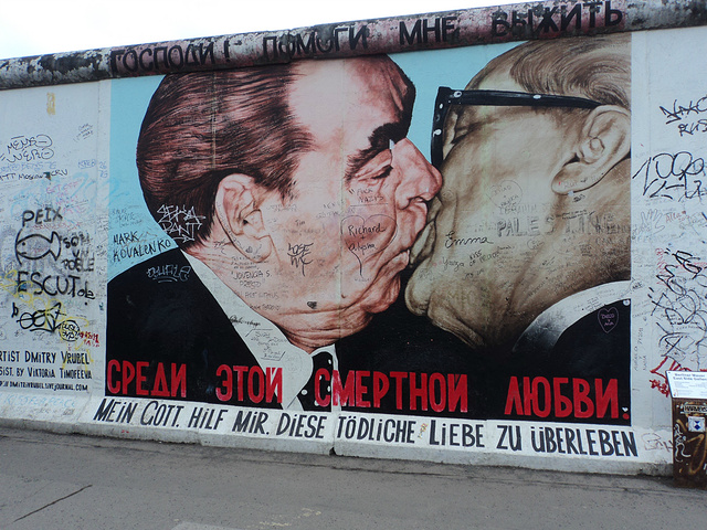 柏林墙主要有三段:东边画廊、查理检查站和北火车站,而东边画廊则是保存下来最长的一段,1.3公里,是艺术者用画笔表达思想的天堂。 【到达方式】东边画廊离市中心景点区稍稍偏远,但搭Sbahn或者Ubahn都能到,乘SBahn到【Ostbahnhof或者Warschauer Strasse站】或者UBahn到【Warschauer Strasse站】,下车后还要耐心走一段路即可。 露天免费,最出名的就是【两名老男人在kiss】那幅画,很多同性恋者都会专门在那幅画底下合影,【这幅画在这段柏林墙中段处,一定要有点耐心找】,当然,其实该画真是的意义是勃列日涅夫与东德签订合作协议后,两个领导人的合作之吻。另外,走去柏林墙的路上,会看到【红色城堡上行黄色火车】,很漂亮。