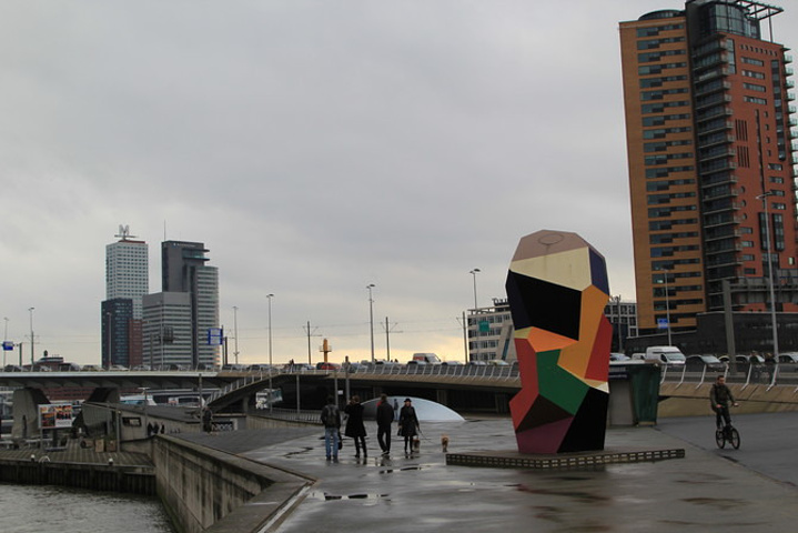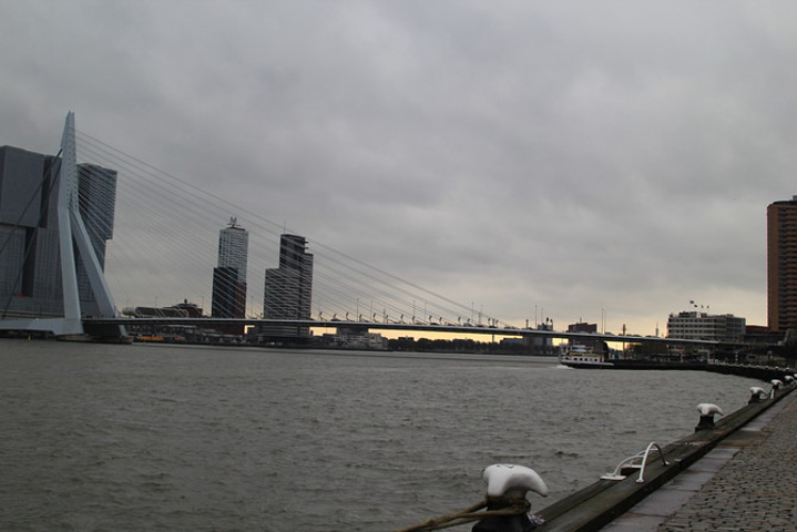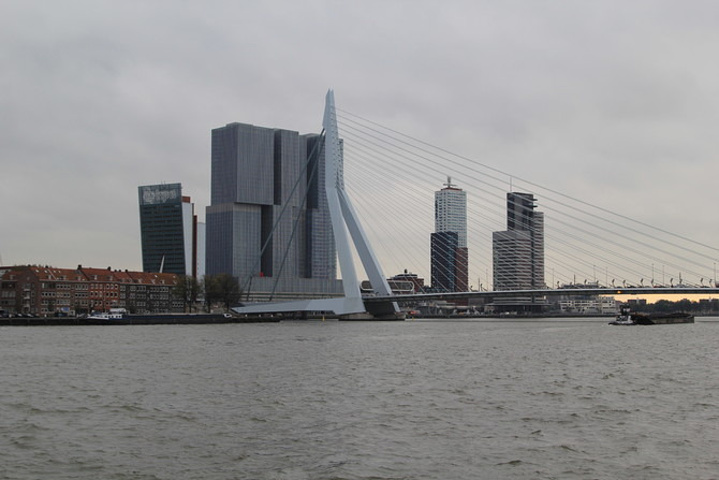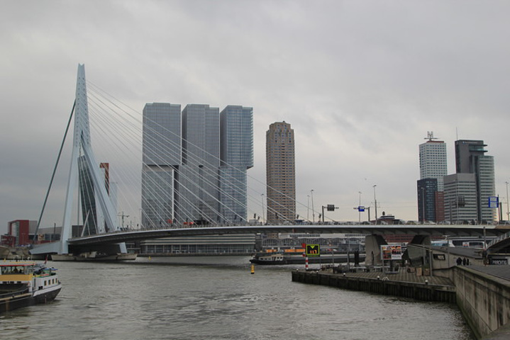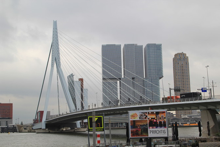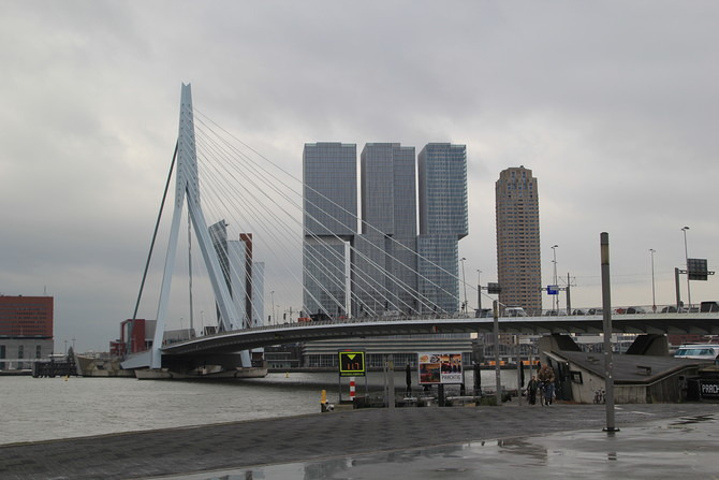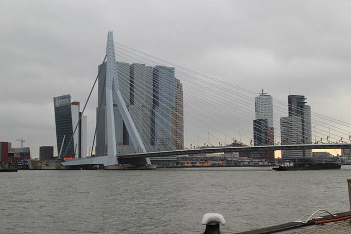伊拉斯谟斯大桥(Erasmusbrug)以“天鹅大桥”的美称闻名于世,拥有简洁俐落的外形,雪白的桥身修长挺拔,像一只优雅的白天鹅高贵地游荡在马斯河上。天鹅大桥单臂高达139米,桥身长达802米,是当时世界上最长的斜拉索桥。这座单向斜拉式大桥将钢索悬挂在塔门上,弯曲着抵抗拉力,支持着桥身。1990年开建大桥落成于1996年,拥有2600级阶梯、数条大道,车辆、电车、脚踏车、行人及溜滑板的运动人士都可以自由通行,可谓荷兰人的实用主义精神的杰出代表。天鹅桥建成之初不仅是世界上最长的斜拉索桥,也是荷兰最高的桥。它已成为鹿特丹的官方标志。
