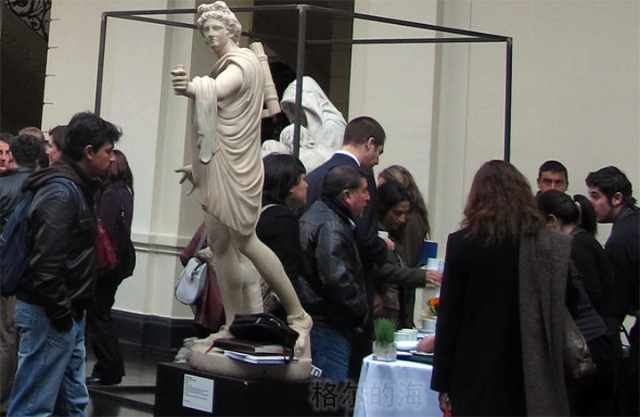 几乎每一个拉美国家都有一个Museo Nacional de Bellas Artes(MNBA),就是国立美术馆。santiago的这座MNBA很幸运。它没有在2010年那场大地震里倒塌,也没有任何损伤;而不远处的前哥伦比亚艺术馆就没有那么好彩了。。。。。。直接的后果就是它一直到2012年7月我们去的时候,还没有修复。 MNBA的内部装璜跟外观一样的堂皇和精致。我们进去的时候已经有很多人了。想不到还有免费的早点和咖啡。本来想问清楚这免费的吃喝是怎么回事,却见老婆和女儿一人已经拿了一块糕点、一杯热饮,在那里开始欣赏大厅里的法国雕塑了。