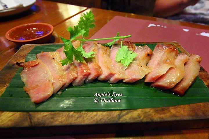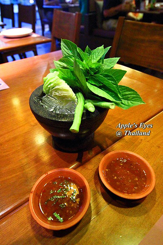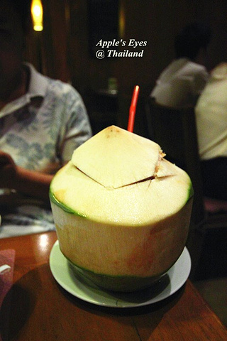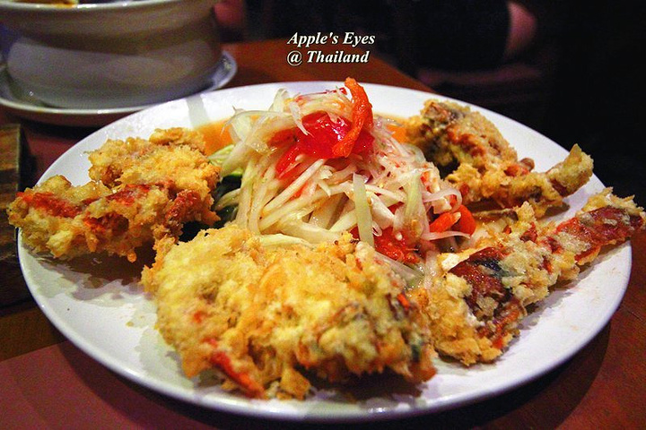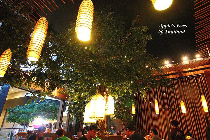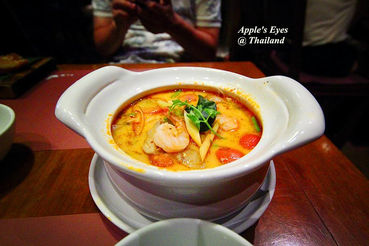 这家餐厅好好吃哦,很正宗泰北料理。KUM POON在Central World 7楼,就在戏院隔壁,大招牌是泰文,小招牌才写着KUM POON,大家要小心不要走过了。装修走泰北乡村风风格,不复杂但很有乡村感觉,店中央有一棵树,店里挂满了灯,好像漫天孔明灯。服务生穿着深蓝色的麻布衣服,令我想起之前去清迈那边的朴素清新。说说食物:1.吃饭前先上了前菜,是一盆蔬菜,生的完全吃不惯,好生的豆角,好生的叶子;2.125B【叉烧】,泰北的叉烧比较甜,淡淡的。我比较喜欢广州的叉烧,味道浓。不过这肉本身是不错的;3.250B【软脚蟹】,非常好吃,眼睛会冒星星的好吃!!在广州就非常爱到寿司店吃软脚蟹天妇罗,但是个头都比较小。KUM POON的软脚蟹SIZE超大的,有帝王蟹大,肉质非常丰满,由于用油炸的所以稍微有点腻,但是拌着中间泰国出名的凉菜:凉拌青木瓜,刚好消腻,超级正。4.150B 【hot and source herbal soupTom Yum】冬阴功,非常好喝!!!我在泰国喝过最好喝的。料足味道酸和辣刚刚好。5.55B【Thai Iced Tea】,在泰国餐厅,除了SHAKE之外我必试的饮品~ 类似我们的奶茶,这间蛮浓郁的;6.70B椰子汁。在泰国正规餐厅吃饭,都是要收服务费和VAT的,这一餐服务费*10%,VAT*7%,合计771B。总体很好吃,我推荐了好几个去泰国的朋友去吃,评价都不错,值得继续向大家推荐