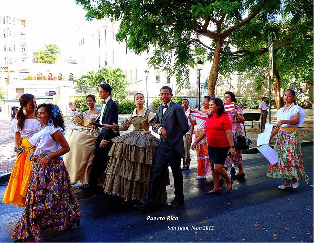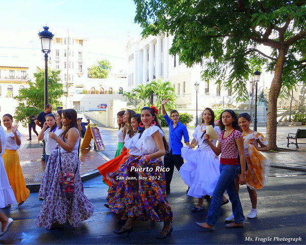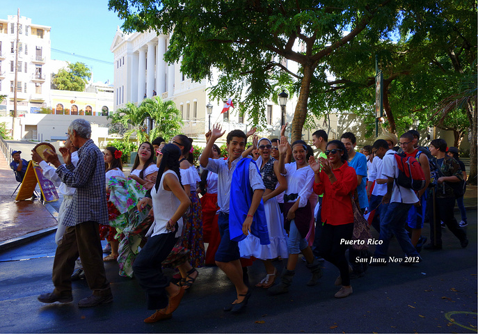于是20号白天我们三人就跟游魂似的在Old San Juan走了大半天。在用完餐后巧遇游行队伍。波多黎各男男女女看见我们几个拿着相机,便使劲向我们招手,丝毫没有害羞的意思。后来一小女孩送了我们一人一面波多黎各的旗子,她自己手绘的噢,背面有她的名字呢。我还开玩笑的跟朋友说,或许我们可以Facebook加她,说不定她长大后成为了有名的画家,我们这面旗子可以还拿去拍卖。(3个没有追求的女人-_-") Old San Juan是个色彩缤纷的小镇,让我想起了葡萄牙的Sintra。到达那天的阳光大好,出的片都是各种给力!逛San Juan真心一天就够了,当地有免费的巴士带你绕Old San Juan一周。不过我和同伴用走的就走了一圈。路很好认,很窄很狭长。走起来其实还是挺累的,因为是石子加山坡的路形。我当时穿了夹脚拖走了一天,很酸。Old San Juan有很多可爱精美的小店,其实是给游客逛的,我没有买什么,一个同伴买了不少。我想要找明信片但都找不到给力的所以最后只买了一张明信片。