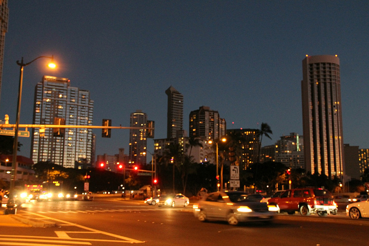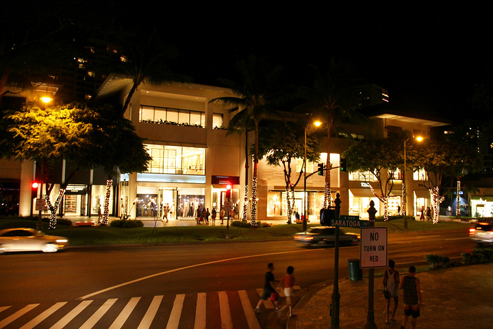晚上,沿着Waikiki大道往西北方向一直走,来到了鼎鼎大名的Macy's百货商店,其实我们的目的不是要来逛商店的,只是想找那间传说中的“阿甘虾餐厅”,可惜方向盲的吃货夫妻最终也没能找得到,算了吧,到此一游吧。 去梅西百货的路上,华灯初上。过了一条河,一直再往西,左拐,右拐,右拐,左拐,再走3个交通灯就能到达梅西百货,购物狂们GO!