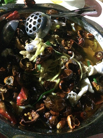重头菜,三鲜火锅!里面有鱿鱼,虾,猪肉,青瓜,白菜。 好吃指数9分,喜欢吃辣的朋友不要错过。