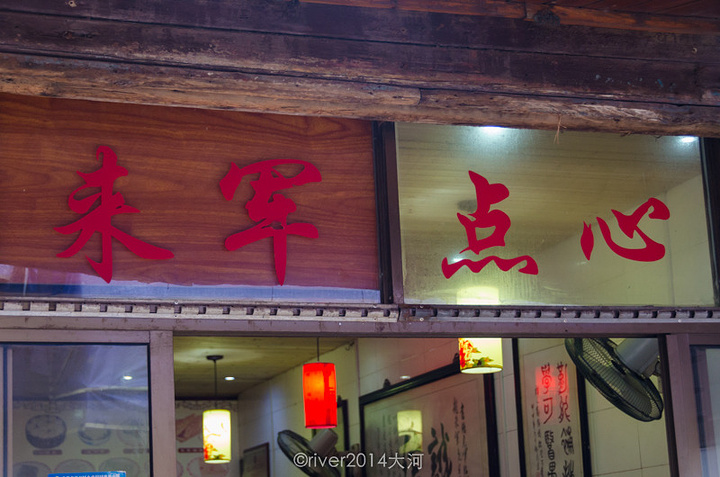 这家店位于同里古镇景区内。同里古镇的餐饮不算便宜,但是也有几家算的上物美价廉的饭馆,来军点心店就是其中之一。古镇入口过桥后往左边走,在一条名叫竹行埭的街上,店面很小。这次住在古镇内的青年旅舍内,店主特意向我推荐这家店,可以来这里吃早餐,种类很多而且价格便宜。 第二天早上7:00多一点就来到店里,这时候客人还不多,不过只过了10分钟就坐满了。店内外边是餐饮区域,里边是操作间。看了一下店内的菜单,早餐的品种确实很丰富,有不下30个品种。点了一碗小馄饨,一份小笼包,还有一份桂花马蹄糕,一共才十元,太超值了。 小馄饨是现包的,等了大约5分钟。小笼包一份4个,不同于上海的汤包,这里的包子是肉馅的,也很好吃。桂花马蹄糕用糯米包着豆沙馅,吃起来甜甜的,表面上还撒着桂花,有特殊的香味,特别推荐这家店。