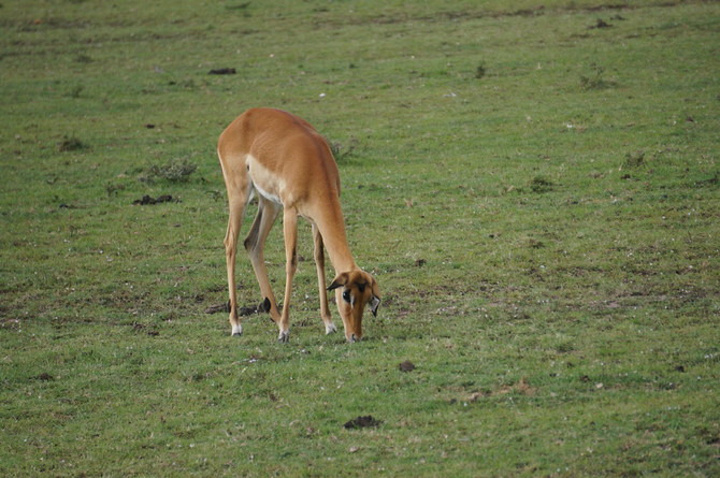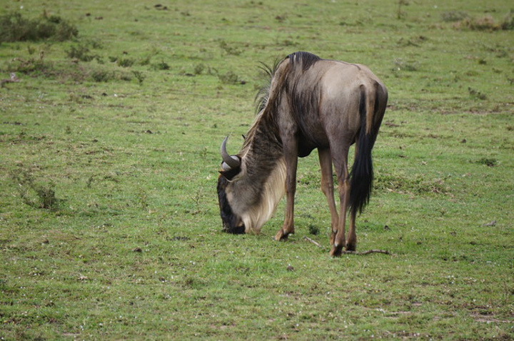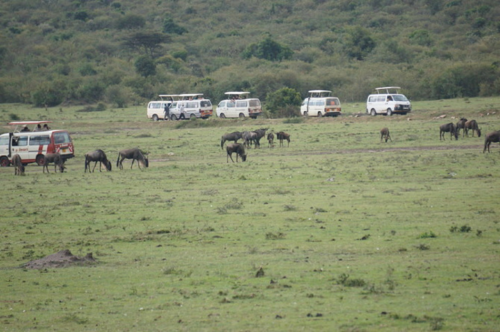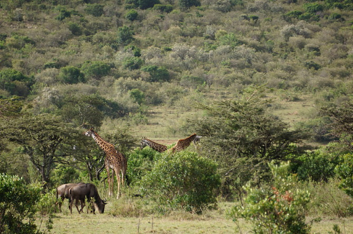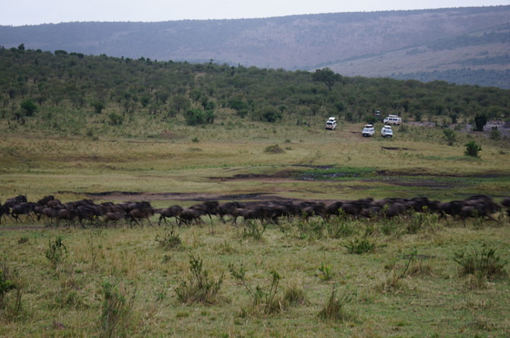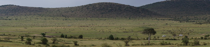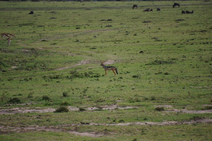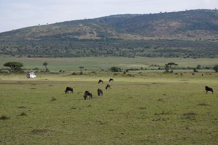 在靠近马赛马拉保护区边缘的这片草原,虽然现在处于草原的旱季,但仍是满目葱绿,所以聚集了大量的角马、斑马、长颈鹿等食草动物,更象是一片青青牧场。