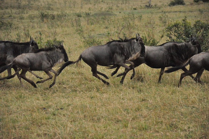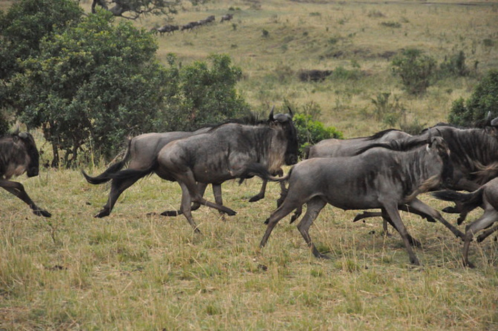 突然间,一大群角马玩命的奔跑起来,大家纷纷猜测有什么情况发生,可观测半天也不见其它动静,但这意外的惊喜也让我们大致领略到一点角马迁徙的壮观场面,也算是对我们此行没能看到 角马迁徙渡河的补偿之一,另一个补偿是在马赛河看到大象家族渡河这一难得景观