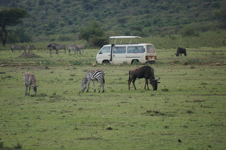 这样的画面体现了人与动物与自然的和睦相处呢还是表现了人类的野蛮闯入? 感觉坦桑尼亚在动物保护方面比肯尼亚做的更好,在坦桑尼亚是绝对不允许车子随意进入到草场碾压草地 的,而在肯尼亚,当司机发现哪个地方出现稀有动物的时候,电台的一通呼叫,瞬间就可以有几十辆车从四面八方蜂拥而至,根本不管是否有路,所以经常看到马赛马拉的草地到处是车辆驶过的痕迹。也许会有人觉得这样更有利于看动物,但人类在满足我们自己的这一私欲的时候是否有考虑到毕竟这里是它们的家园,而我们不过是一群不请自来的不速之客而已!