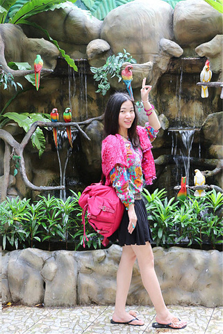 那个老虎我没有拍哦,反正是把老虎和猪混合关在一起。大概就是小老虎和大猪,大老虎和小猪。我觉得这样其实挺不“虎道”和“猪道”的。站在这个地方拍一张吧,那些彩色的鹦鹉挺好看但是假的!