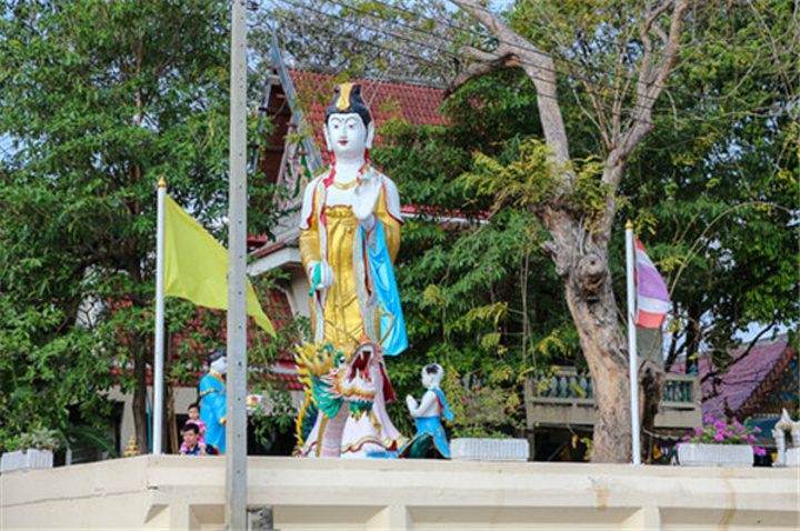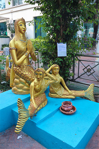 第二天一早,就去大皇宫了。去之前坐船在湄南河上去喂鱼,这小小的码头上竟然发现有美人鱼雕塑,不过有意思的是,这个美人鱼还是一家三口。估计是中年美人女吧!