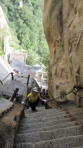 奇险天下第一山!我认为人一辈子一定要去一趟华山,尤其是男人。华山现在有三条登山路:第一条是索道,可直达北峰,推荐。第二条是智取华山道,除了锻炼体力,没什么风景,不推荐。第三条就是俗称的“自古华山一条路”,人文、风景、休息点都很多,我们选择了这条路。第一站是登山必经的玉泉院,过了五龙桥就到了华山山门,门口登山的人看上去不多,估计大部分的驴友都选择晚上登山。开始上行后一路都是缓坡,不陡但很熬人。过了北斗坪,就到了回心石。从回心石开始,登山路真正开始。这些长长的阶梯,好多几乎直上直下,漫长而没有尽头。爬这些梯子的时候,我很想念电梯。从回心石开始前面就是三险:千尺幢、百尺峡、老君犁沟。过了老君犁沟,走过一段平路,就是北峰。这里有索道站和相对而言条件较好的宾馆。可以坐索道直接从这里开始登山,这样要轻松点,但走不了千尺幢。离开北峰,紧接着就是擦耳崖,然后是大名鼎鼎的苍龙岭。过了金锁关,山路分为两条,一条先上东峰,再到南峰和西峰,另一条先到西峰和南峰,成一环形。东峰有一险处,即华山三险之一的云梯。走到东峰饭店旁就是著名的鹞子翻身。接着开始向南峰进发。南峰海拔有2160米,是华山最高峰,有华山最险的长空栈道。离开南峰,我们继续向最后一峰——西峰前进。最后到北峰坐索道返回。
