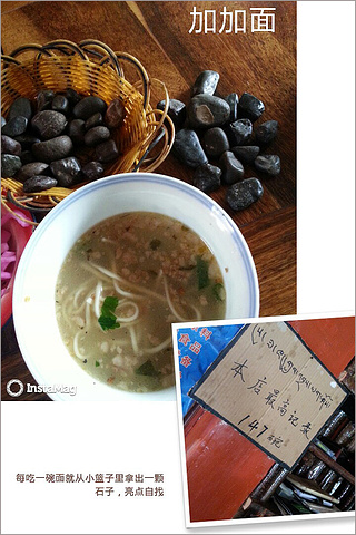 午餐周大哥带我们去吃加加面。好奇怪的名字。我们每人桌前有一个小篮子,篮子里放着很多黑色的小石子。一个藏族姑娘在我们每个人面前放了一小碗面,我一看,那面也就是一筷子的量。她告诉我们吃完一碗,就从篮子里拿出一颗石头放在桌面上,等吃完了看看桌面上的石头,就知道自己吃了几碗。原来如此。我跟老公都不约而同地笑起来,那姑娘来来回回地为我们端面,累不累啊!如果吃客多的话,怎么忙得过来呢?最终结果,我吃了十四碗,老公因为高反只吃了十一碗,周大哥吃了二十五碗。而店里的最高纪录是147碗,有食客能超过该纪录,可以免费哦!