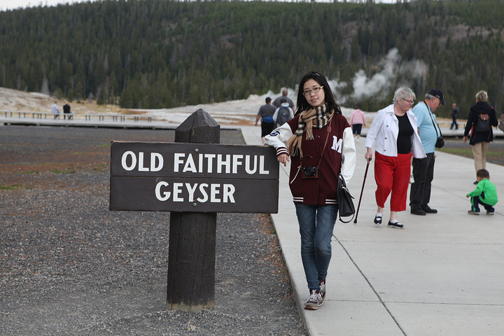 老忠实是我去过的黄石所有景点里面唯一有大型餐饮服务的地方,大家在这里一边吃饭一边等着老忠实的定时喷发,老忠实大概每隔30到90分钟一定会喷发一次,从不食言,如果间隔时间短喷发就弱一些,反之就剧烈一些,到达老忠实后先前往游客中心查看今天的喷发时间表,然后在根据喷发时间安排吃饭,其实后来才发现几乎不需要去看时间表,是需要看老忠实周围椅子上的游客数量就能轻松的判断还有多久喷发,我们到达的时候长椅上只有零零散散几个人,一看时刻表,不出所料,果然刚刚喷发过,下一次还要等70分钟,所以我们很从容的去餐厅吃饭了