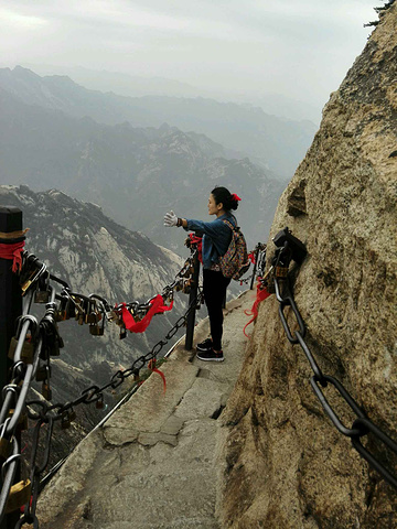 前一天晚上住在了华山脚下,从旅店走五分钟就可以到达玉泉院,穿过玉泉院和一条铁道就是华山的售票口,共计10分钟。华山早晨八点多才上山的我们,四个小时爬到了北峰。建议①要是想一日游而且想走过五峰的朋友,从西峰索道上,北峰索道下;②想要一日游而且不需要五个峰全部走过的朋友,从北峰上,到南峰,坐西峰索道下;③想要两日游的朋友,从北峰爬上。我们是第二种。索道晚七点结束运营。白天请穿半袖,流汗会把衣服全部浸湿的。想要过夜的,一定要带羽绒服,我六点多下山的时候已经懂得手冰凉。华山学生票90元,索道学生八折100元,西峰索道到山下的大巴无折扣40元。