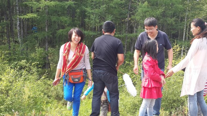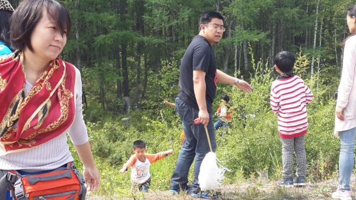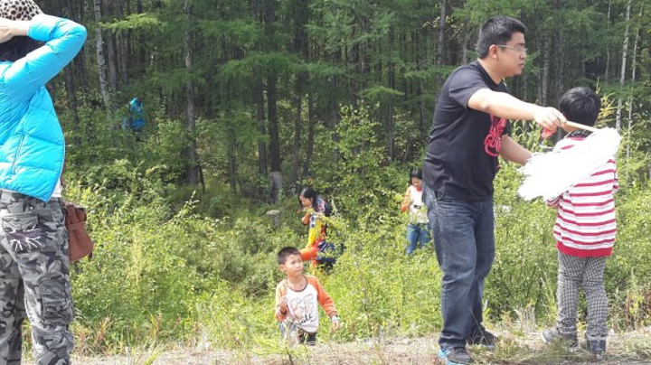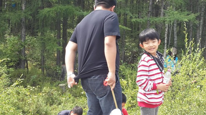 这时我们在向北加的蓝莓园采摘 他告诉我我们大家这是他的蓝莓园,下去随便摘吧,孩儿们一窝蜂下去,一个粒没采到,"有熊快蹲下”领队佗师傅大吼一声,大家全部蹲下,原来蓝莓树这么矮,蹲下才能发现野生的蓝莓不大,很酸,这肯定是好东西了,果果的衣服被蓝莓染上了紫色,听向北叔叔说洗不掉了,嚎啕大哭