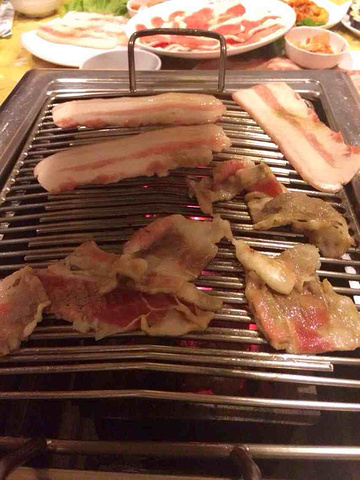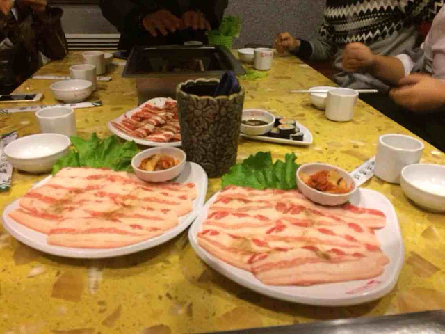 很少去吃韩国烤肉,一来对韩国食物不太感兴趣,而来觉得烤肉有些不太健康。有去过一次,四个人去得。点了一盘的烤肉,没办法,都是肉食动物。卷着卷心菜一起吃还不错。石锅拌饭一般,好大份,我们都没怎么吃。倒是黄油拿了好几个