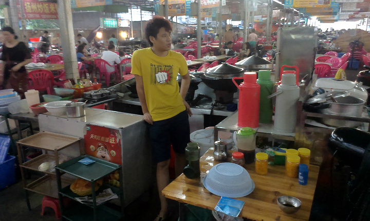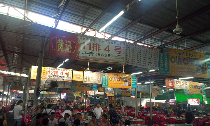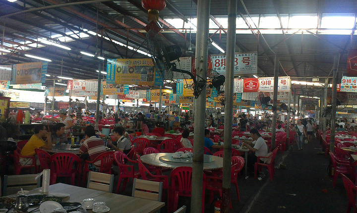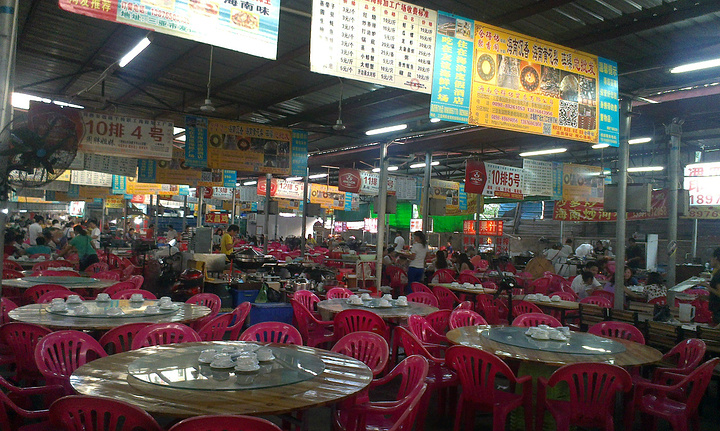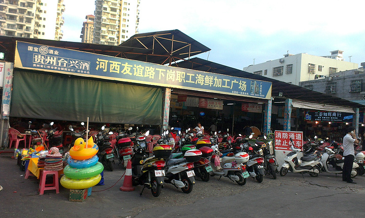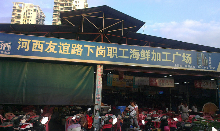 三亚河西友谊路下岗职工海鲜加工广场是三亚多个海鲜加工广场的其中之一。这里是一个大棚里面很多家加工摊位,属于海鲜加工摊位聚集地,里面有以长排卖海鲜的摊位,分不同的老板商贩,发现这里的价格和第一市场差不多,有的海鲜价格比第一市场高,特别是这里卖的四角豆35元/斤,五指山野菜元25元/斤,地瓜叶15/把,空心菜15元/把都高的离谱,第一市场这些青菜便宜多了。算下来这里吃一顿海鲜挺贵的,而且这里的环境空气不好,一个大棚里很多家大排档,炒菜的时刻,空气不能及时往外排,使得里面空气很呛人。个人觉得还是在那单独门面的海鲜排挡加工海鲜,环境和空气好一点。河西友谊路下岗职工海鲜加工广场大门。大棚入口,设计的时候有点问题,没有在中间摊位处设计抽风口,炒菜的时候,油烟不能抽出,在里面吃饭很呛。还是有很多人购买了海鲜来这里加工。大棚里面的环境,很多摊位。另一个角度看摊位。我们在11排4号加工的海鲜,感觉这里卫生做得很好,味道也可以。老板服务热情亲切。老板的儿子。加工海鲜的调料配料。很丰盛哦,海鲜挺鲜美,青菜味道也可以。粉蒸扇贝。白灼虾。炒芒果螺。白切加积鸭。蒜炒五指山野菜,凉拌青瓜。蒸生蚝白灼虾蒸生蚝蒜炒四角豆。 总体感觉,这里也就是打着下岗职工加工海鲜广场的旗号吧,环境卫生一般,比较吵杂,空气不流通,希望能对空气流通这个设施进行改善。这样就更能吸引客人了。还有蔬菜的价格高的离谱,希望能够按照当地菜市场的价格销售蔬菜,或者价格高10%%这样还能接受,这里的价格高出当地市场价格很多了,有的已经有10倍了。希望向更好的方向发展!