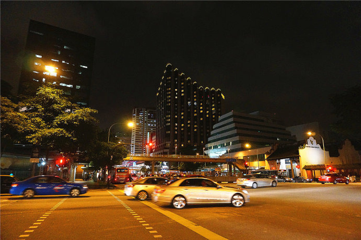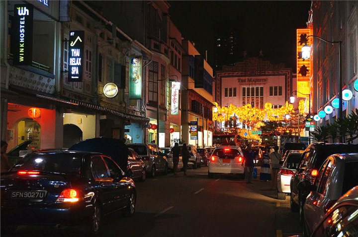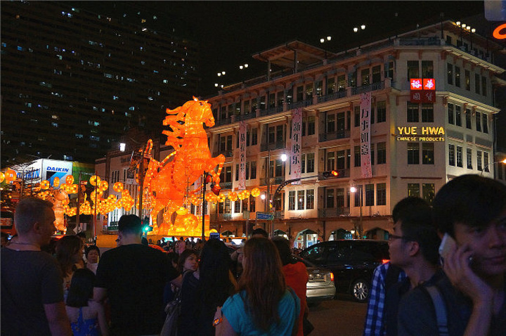 松发肉骨茶位置很好找,就在地铁克拉码头(Clarke Quay)站出来不远,这里算是新加坡很有名的商业聚集地。走到牛车水(Chinatown)也就十来分钟,吃饱喝足后,正赶上华灯初上,大俊决定带着我们一直溜达到金沙酒店那边去看看新加坡的夜景。 牛车水是个很有意思的名字,听起来好古朴,据说我们华人的祖先漂洋过海来到这里的时候,没有淡水,每天只能拉着自己的牛车到安祥山的史必灵路去取水作为生活用。日子久了,这里就叫做牛车水了。 我们来的这个季节算是新加坡比较舒服的时候,慢慢的走在街上,小风嗖嗖的吹过,不冷不热,看着对面的高楼大厦、来往的车辆和穿梭的人群,有好长时间大民和大俊说的话,我竟然完全没有走心,沉浸在一个人的世界里傻笑着,不知道想什么,也许觉得在陌生的地方,有朋友和家人陪伴的感觉太好了吧?! 当身边的游人见见多了起来的时候,就看到了Chinatown的入口了。一匹周身闪着金光的骏马出现在面前,昂首阔步的样子,很有气势,整条街道装扮的也很有中国特色,是的,马年来了!