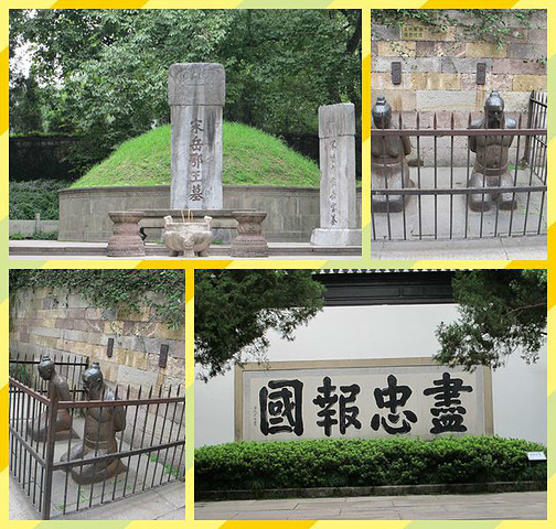 培养孩子爱国主义精神的亲子之旅。 全国各地的岳王庙有好几座,估计杭州那个是最有名气的吧。 我们的旅行时间:2014年的5月 适合旅游的时间:1-12月份,夏季会热一些。 推荐游玩的时间:1-2小时。 门票:25元,不便宜,建议减价 。 岳王庙我来过算是第二次,第一次是1994年,相隔20年了,当时庙里还有些骗子卖假的铜乌龟,说是祖传金龟,还有卖假龙井茶的,用喝过的茶叶装好卖给不了解情况的游客,现在仍然要提醒大家注意,不要破费。 岳王庙可以作为游西湖的的一个景点来参观,游完岳王庙正对的路就是苏堤的路,所以可以看完岳王庙继续西湖之旅。 岳王庙正门有2付对联很有名气:三十功名尘与土,八千里路云和月,还有一个就是“青山有幸埋忠骨,白铁无辜铸倿臣”,还我河山牌匾很有气魄,正殿后面有岳飞和岳云、张宪的衣冠冢,还有著名的四个奸臣的跪像。 现在看来岳飞未必是秦桧害死的,赵构恐怕是第一凶手,秦桧夫妻背负了骂名,替领导背黑锅了。 不过岳飞和岳家军确实很厉害,中国历代将领和军队据对排的上前三甲的。 精忠报国的故事和岳飞抗金的故事教育年青一代,我们从小就是在这样的故事中长大的。 门口经常有卖小吃的,有一种叫“桧饼”的可以尝一下,表达一下憎恨秦桧的的 怒意。