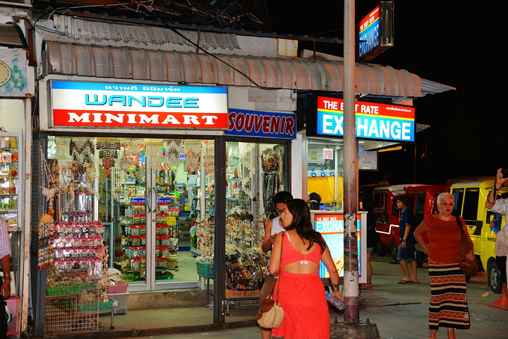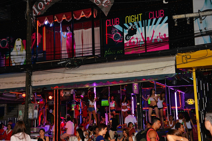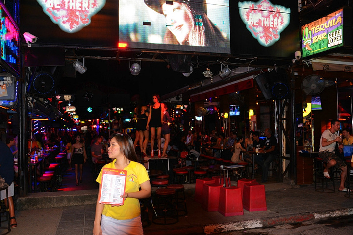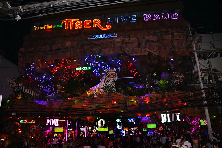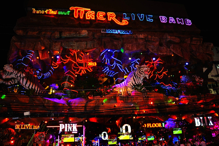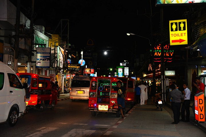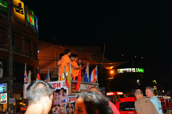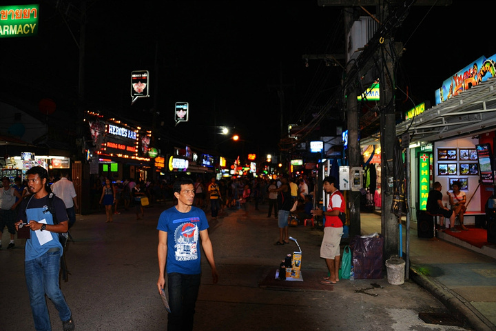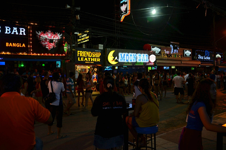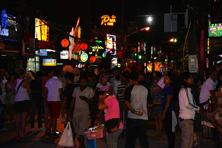 饭后孟豪打电话,我们借机说你们赶紧去买明天的船票,我们去酒吧街,在酒吧街等你们,她说没有电话,联系不上我们,我说就在老虎酒吧没刚才过来的时候你看见的那家,我们赶忙匆匆离开。 在江西冷商场与孟豪、应朔他们见面,大家就慢悠悠的去往酒吧街,今天是第一天到芭东,这里的夜晚可比卡马拉热闹多了,酒吧街到处都是各国游客,很多酒吧门口都有招呼进去喝酒的酒推在门口招呼,街上还有很多人拿着大尺度的美女图吆喝男性游客去看成人秀的,有的酒吧街还有站在吧台上跳舞的,基本都是人妖,吸引很多游客驻足,街道中间还有穿着惊艳服装人妖在招呼游客合影留念的,真的是打开眼界了。 我们找了一家离人妖很近的酒吧坐下,顺便还能欣赏下,我和老婆要了两瓶当地的老虎啤酒,90B,剩下的他们要的果汁好像是50B一杯,刚坐下没多久那些人妖全不见了,呵呵~~失算啦,不过坐在街边歇歇脚也是不错的选择,大家坐在一起畅谈前几天在普吉的感受,下午包车的事情,司机没有问我们要超时费,应朔最后给司机50B小费,他们下车后还在江西冷做了美容面膜,明显看上去比下午白了很多,孟豪他们也是在酒店洗漱休息后就出来了。我们酒吧的旁边突然人声鼎沸,很多游客围在路边看,我们几个立刻跑过去看,两个人妖在吧台上大尺度的表演艳舞,时而做出些夸张动作和暴露重点部位,引的很多游客尖叫,我们则拿出长焦相机拍摄,时而人妖对着镜头还给我们一个笑脸,哈哈~~~抓拍了很多哈,我们返回座位后,他们几个女士也跑着过去看,这算是来酒吧街看到的最精彩部分了吧,应朔两口子觉得太累,早早就走了,我们跟孟豪还继续玩了会,到十点多才离开,在接口看见有卖玫瑰花的女孩,40B买了两支,送给今天过生日的老婆。之前一直嚷嚷着要呢,今天刚好在普吉,又是生日,那是一定要送的哈。 回到酒店都晚上十一点了,好困啊,明天要去PP岛,准备好明天的装备,期待明天。