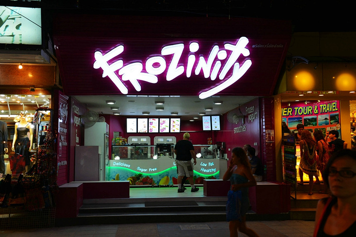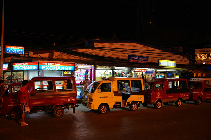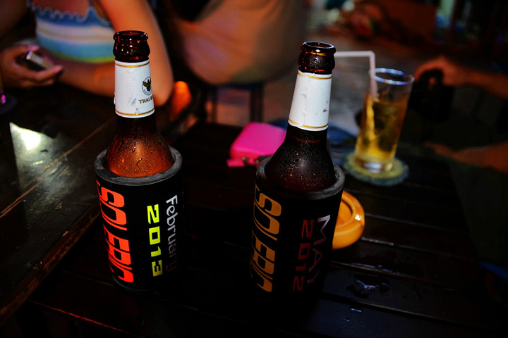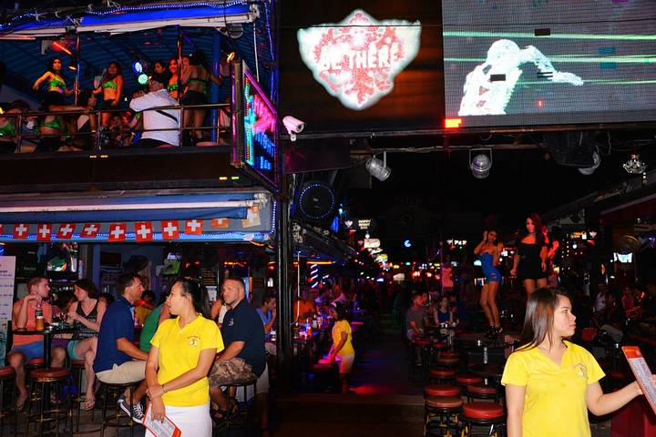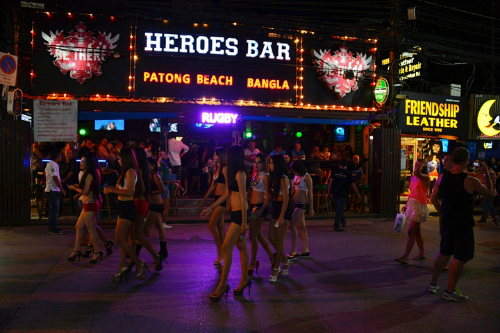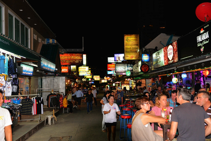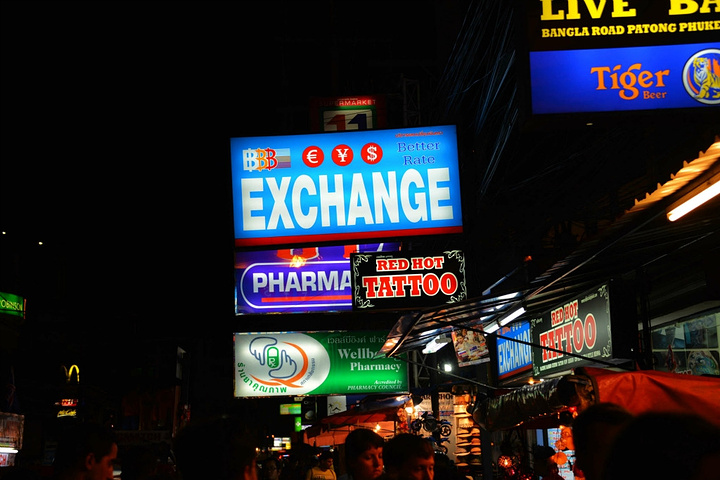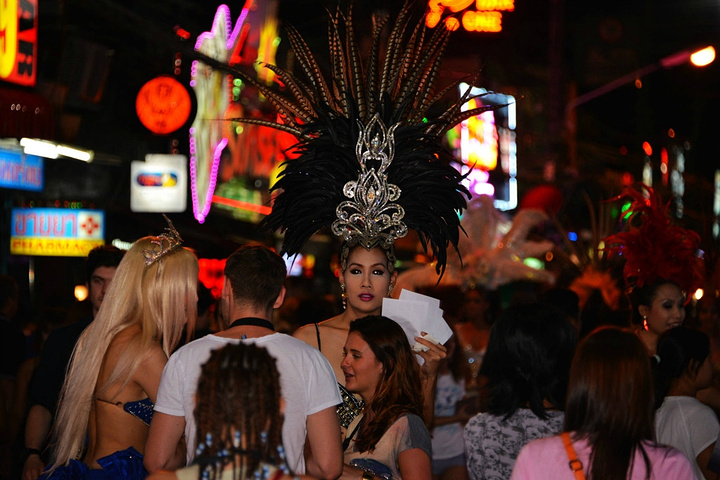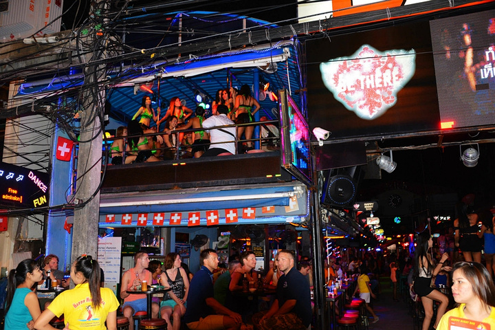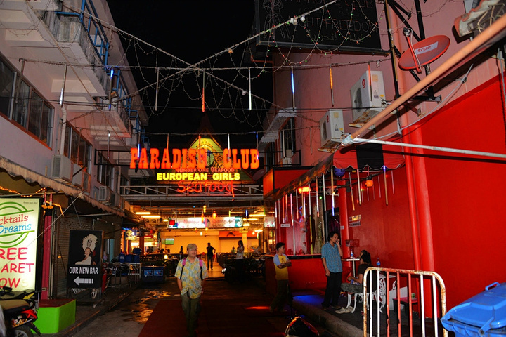 饭后孟豪打电话,我们借机说你们赶紧去买明天的船票,我们去酒吧街,在酒吧街等你们,她说没有电话,联系不上我们,我说就在老虎酒吧没刚才过来的时候你看见的那家,我们赶忙匆匆离开。 在江西冷商场与孟豪、应朔他们见面,大家就慢悠悠的去往酒吧街,今天是第一天到芭东,这里的夜晚可比卡马拉热闹多了,酒吧街到处都是各国游客,很多酒吧门口都有招呼进去喝酒的酒推在门口招呼,街上还有很多人拿着大尺度的美女图吆喝男性游客去看成人秀的,有的酒吧街还有站在吧台上跳舞的,基本都是人妖,吸引很多游客驻足,街道中间还有穿着惊艳服装人妖在招呼游客合影留念的,真的是打开眼界了。 我们找了一家离人妖很近的酒吧坐下,顺便还能欣赏下,我和老婆要了两瓶当地的老虎啤酒,90B,剩下的他们要的果汁好像是50B一杯,刚坐下没多久那些人妖全不见了,呵呵~~失算啦,不过坐在街边歇歇脚也是不错的选择,大家坐在一起畅谈前几天在普吉的感受,下午包车的事情,司机没有问我们要超时费,应朔最后给司机50B小费,他们下车后还在江西冷做了美容面膜,明显看上去比下午白了很多,孟豪他们也是在酒店洗漱休息后就出来了。我们酒吧的旁边突然人声鼎沸,很多游客围在路边看,我们几个立刻跑过去看,两个人妖在吧台上大尺度的表演艳舞,时而做出些夸张动作和暴露重点部位,引的很多游客尖叫,我们则拿出长焦相机拍摄,时而人妖对着镜头还给我们一个笑脸,哈哈~~~抓拍了很多哈,我们返回座位后,他们几个女士也跑着过去看,这算是来酒吧街看到的最精彩部分了吧,应朔两口子觉得太累,早早就走了,我们跟孟豪还继续玩了会,到十点多才离开,在接口看见有卖玫瑰花的女孩,40B买了两支,送给今天过生日的老婆。之前一直嚷嚷着要呢,今天刚好在普吉,又是生日,那是一定要送的哈。 回到酒店都晚上十一点了,好困啊,明天要去PP岛,准备好明天的装备,期待明天。