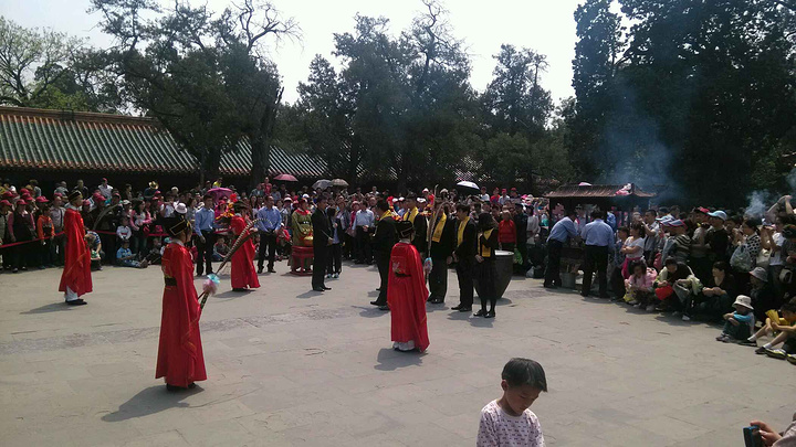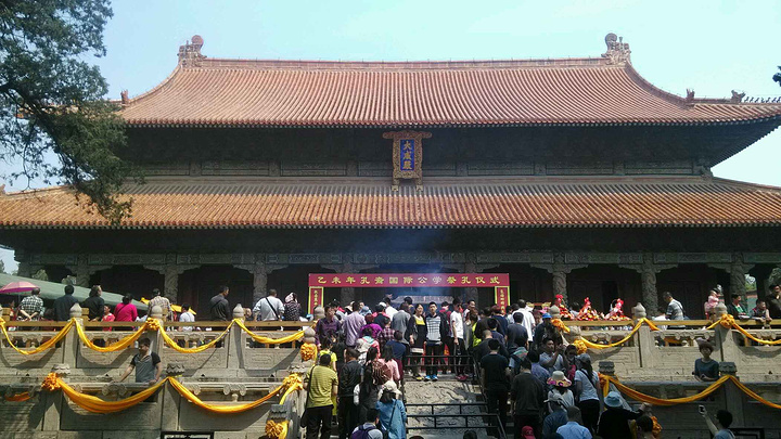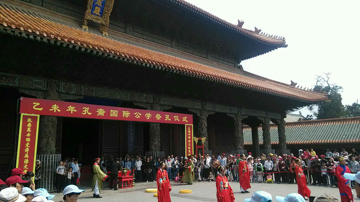 孔府,曲阜三孔第一,三联票160元,单票60元,开车到的曲阜,游客中心停车10元,中心大厅有卖票的,进去有卖字的扇子上写字,字画什么的充满文化气息。学生票有半价,买好票会有人过来推荐全程电动车票,15块一个人。三孔整个交通有景区接送,有站牌。开始以为是坑,后面知道是正规的,不得不说这个旅游做的是蛮好的,不宰客,这样才是可持续发展,也是之所以景区会火爆 。到电动车站,服务很好,服务人员鞠躬问好也是在景区第一次见到,很快就到了孔府门口,有地陪导游,没要,跟着别人叫的沾小便宜,一路听下来其实发现导游还是很专业的 。 进去都是门,一道接着一道。都很有典故,孔府是孔子的子孙后人的居住地,并且不断的扩大,孔圣人不愧是圣人,古代帝王也只是一朝之王,孔子的思想流传至今仍然有很大影响,现在海内外的孔子学院处处开花! 孔府内柏树随处可见,进门的两百零一个桥洞典故等等处处都是柏树的故事,树龄都有几百年甚至千年了。期间也不是长假期但是人也很多周日。 全程走下来有一个半小时了。刚好赶上祭孔仪式,很有意思。长知识了也。 有文化气息的地方就是不一样,两个人慢慢走下来,边走边看边听,慢慢品味吹吹风也是一种心情。 还有很多人带着小孩子来求学运等等。 值得推荐的地方。
