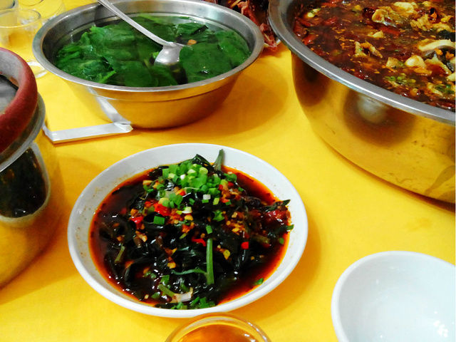 逛完龙水湖,回到酒店休整了下,中午同事亲戚给我们安排的当地最有特色的“肥肠鱼”,离我们住宿的地方开车有十来分钟车程,算是一个农家乐了,沿途卖鱼的鱼庄很多,这里的特色就是吃鱼,“温家肥肠鱼”从外表看上去一般,可是端上餐桌的特色肥肠鱼那是一个地道啊,味道很正、很正,还有配菜是软骨腊肉、牛肉拌辣椒面、蕨根粉丝、青菜汤,看上去就流口水啊,哈哈~~