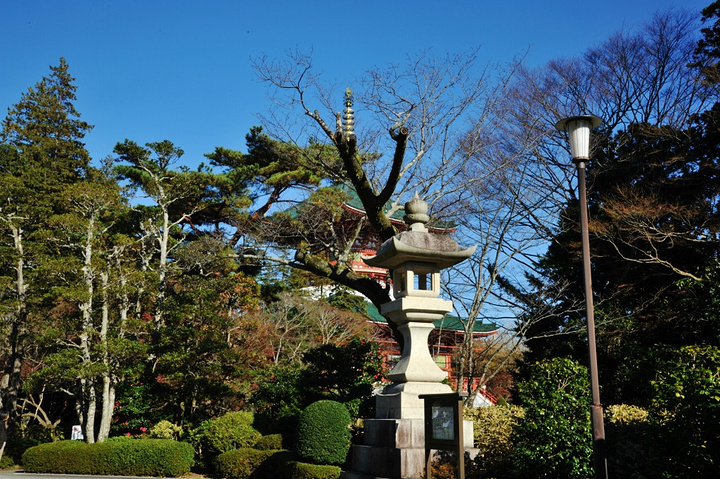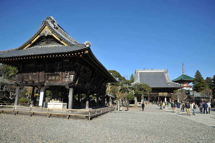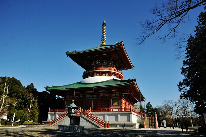 在成田山寺的宽敞地面上可以看到各种各样的寺庙建筑,包括寺庙的新旧主殿、三重塔和一个巨大的多宝塔,命名为“大平和塔”。还有一个宜人的公园,里面结合了传统日式和欧式特色。